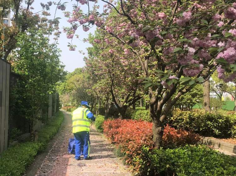 今年清明节后,晚樱进入观赏期,杨浦区绿化和市容管理局宣传部门联动绿化、环卫等业务部门,密切关注着天气和晚樱花期。刚刚过去的周末,观察到晚樱花瓣开始飘零,遂决定本周动态实施“落樱不扫”精细化保洁模式。