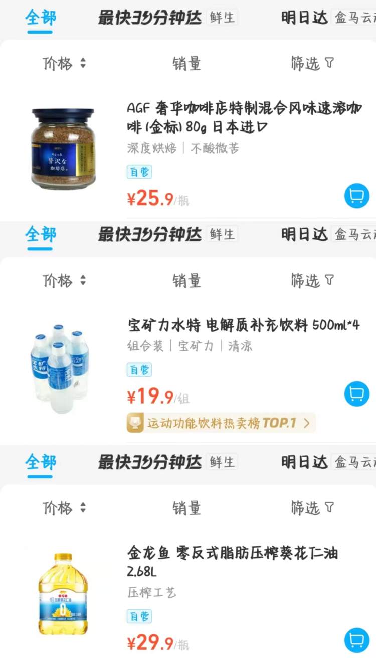 比如,日本进口的AGF速溶咖啡(蓝瓶)80克,之前的线上价格为39.9元,线下专享价为29.5元,调整后线上线下统一为25.9元;意大利进口的圣培露充气天然矿泉水500毫升6瓶装,之前的线上价格为39.9元,线下专享价为35.1元,调整后线上线下统一为34.9元;宝矿力水特电解质补充饮料 500毫升4瓶装,之前的线上价格为22.8元,调整后统一为线下专享价的19.9元;金龙鱼零反式脂肪压榨葵花仁油 2.68L,之前的线上价格为39.9元,调整后统一为线下专享价的29.9元……