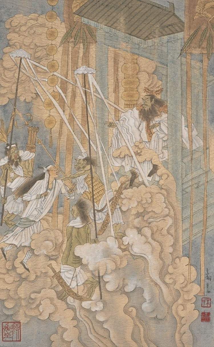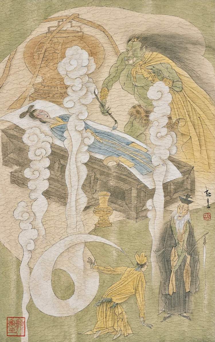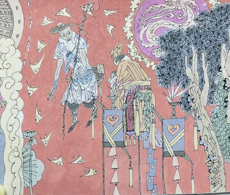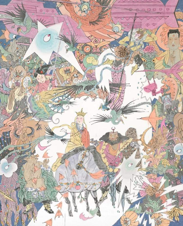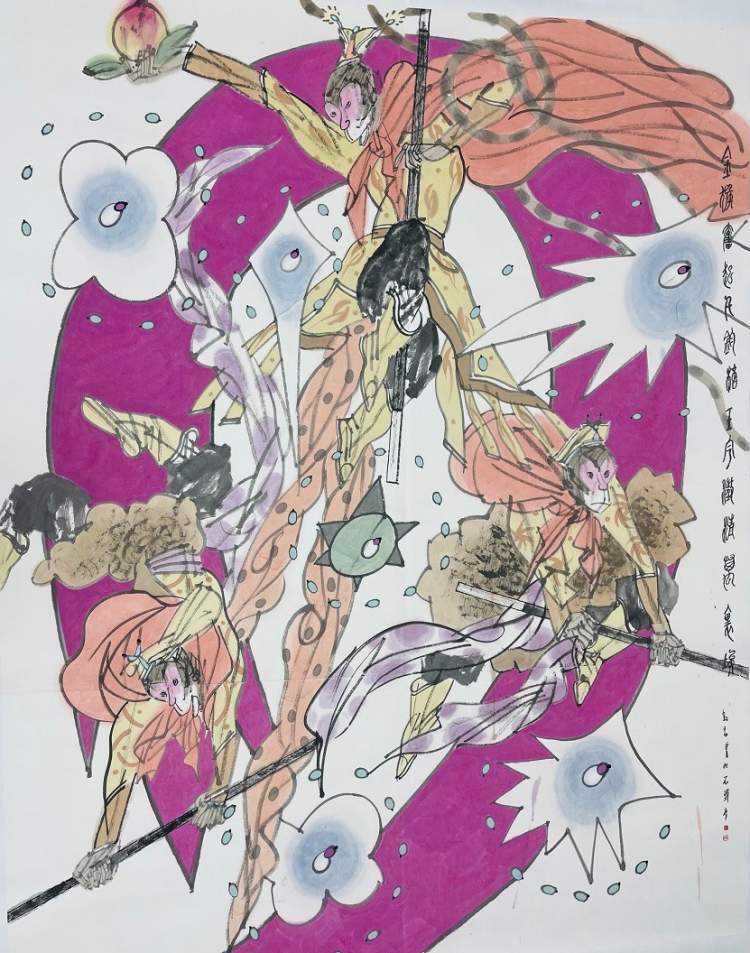 朱新昌画的《西游记》,也讲究线条,但线条隐于色彩之中,若隐若现,别有韵味,其中的艺术形象,充满了丰富的喻意,令观者产生无穷的联想。