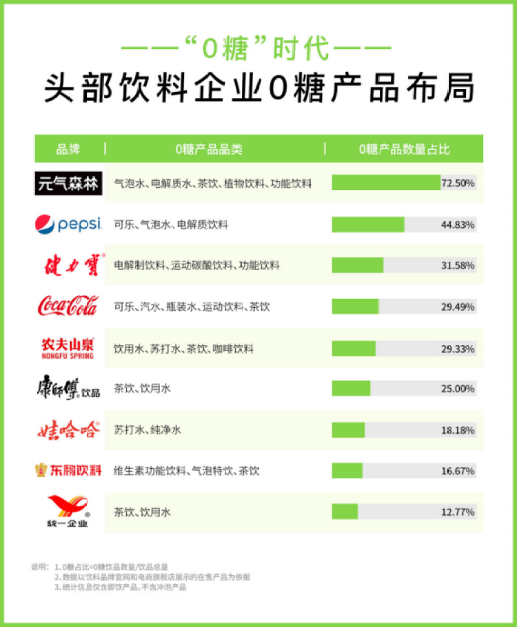 目前百事、可口可乐等传统饮料企业都在含糖饮料之外开辟无糖赛道,饮品新势力元气森林从品牌创立之初就开始布局无糖赛道,在行业内占据了先发优势,目前其无糖产品在整个产品矩阵中占比已达70%以上,无糖饮品更覆盖无糖茶、无糖气泡水、无糖功能性饮料等细分赛道。