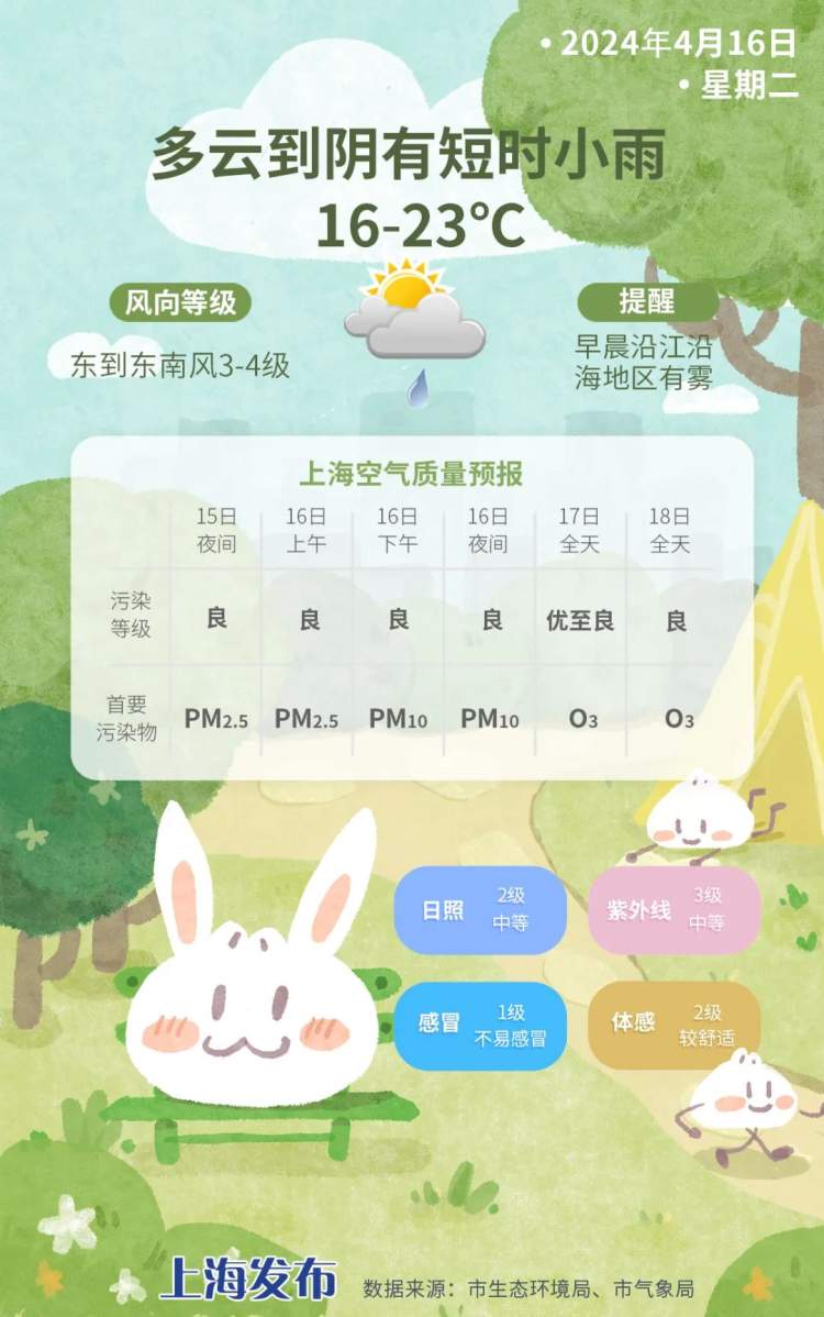 今天申城云系增多,白天多云到阴有短时小雨,夜里转有时有阵雨,16~23℃,东到东南风3~4级,相对湿度95%~65%。