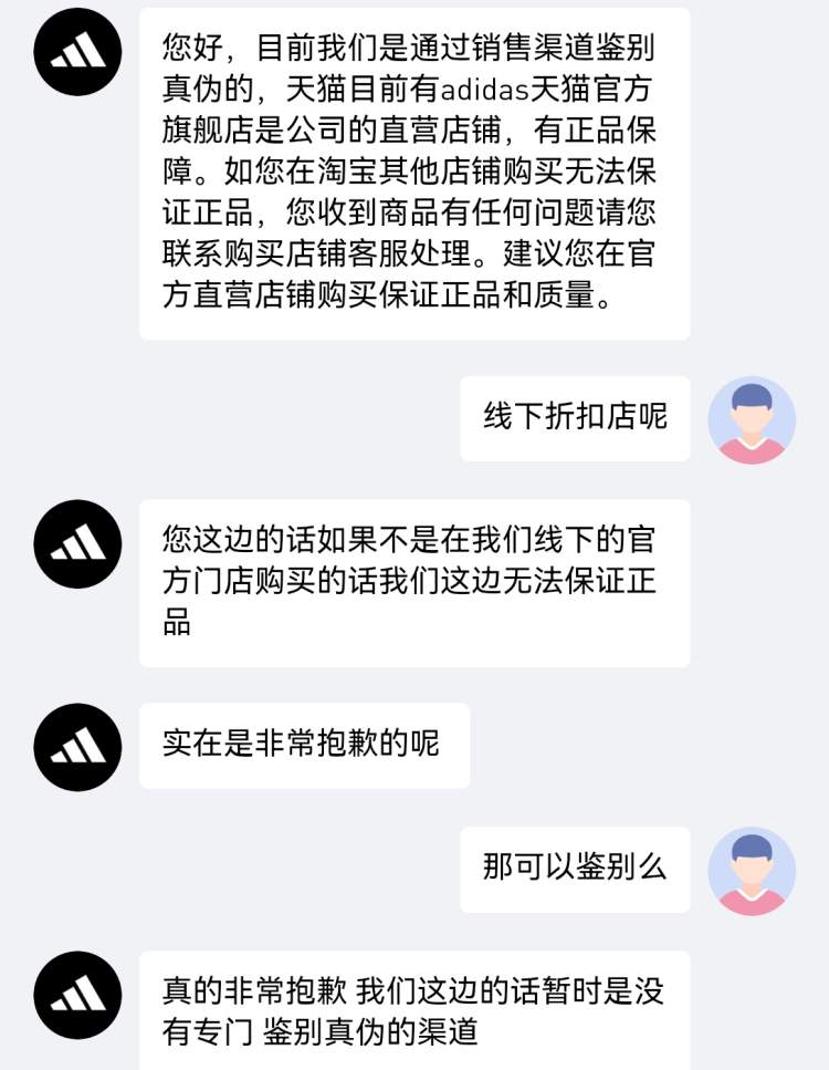 “在折扣店买的衣服,怎样查是不是正品?”记者拿同样的问题询问阿迪达斯官方客服,得到的回应称,“目前没有专门鉴别真伪的其他办法,唯一的鉴别方法就是销售渠道,只有天猫官方旗舰店、线下官方门店购买才有正品保障,其他渠道购买无法保证是正品。”因此,阿迪达斯官方客服建议通过品牌的官方直营店铺或线下官方门店购买,保证正品和质量。