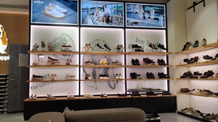 下午时段,在飞洲国际暇步士奥特莱斯店,记者看到有不少市民在专柜前挑选、试穿新款鞋,顾客不少,但有2位专柜工作人员的情况下,无需排队等待试穿或结账;