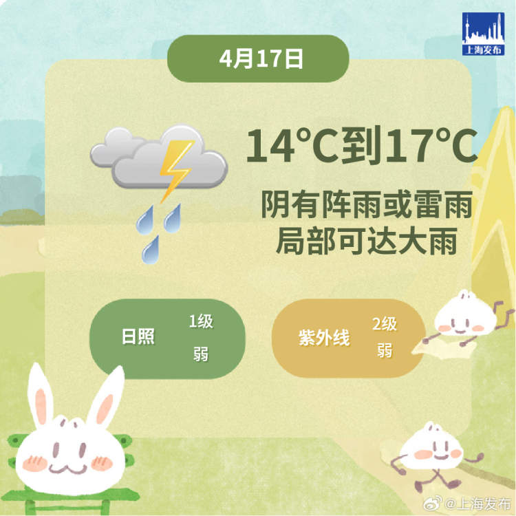 申城天气:今天局部有大雨,并伴雷电,最高气温降至17℃ 周到君 2024-4-17 来源:周到上海 上海今天阴有阵雨或雷雨,局部可达大雨,并伴有雷电,大家注意交通安全。 今天吹的是偏东风转东北风,风力都是3-4级,全天气温在14-17℃之间,体感明显变凉。 今晚雨止转多云,周四阳光回归,周五前后还会有一次较为明显的雷雨过程。 (内容综合自上海发布、上海市天气) 来源:周到上海 作者:周到君 赞一个 (0)