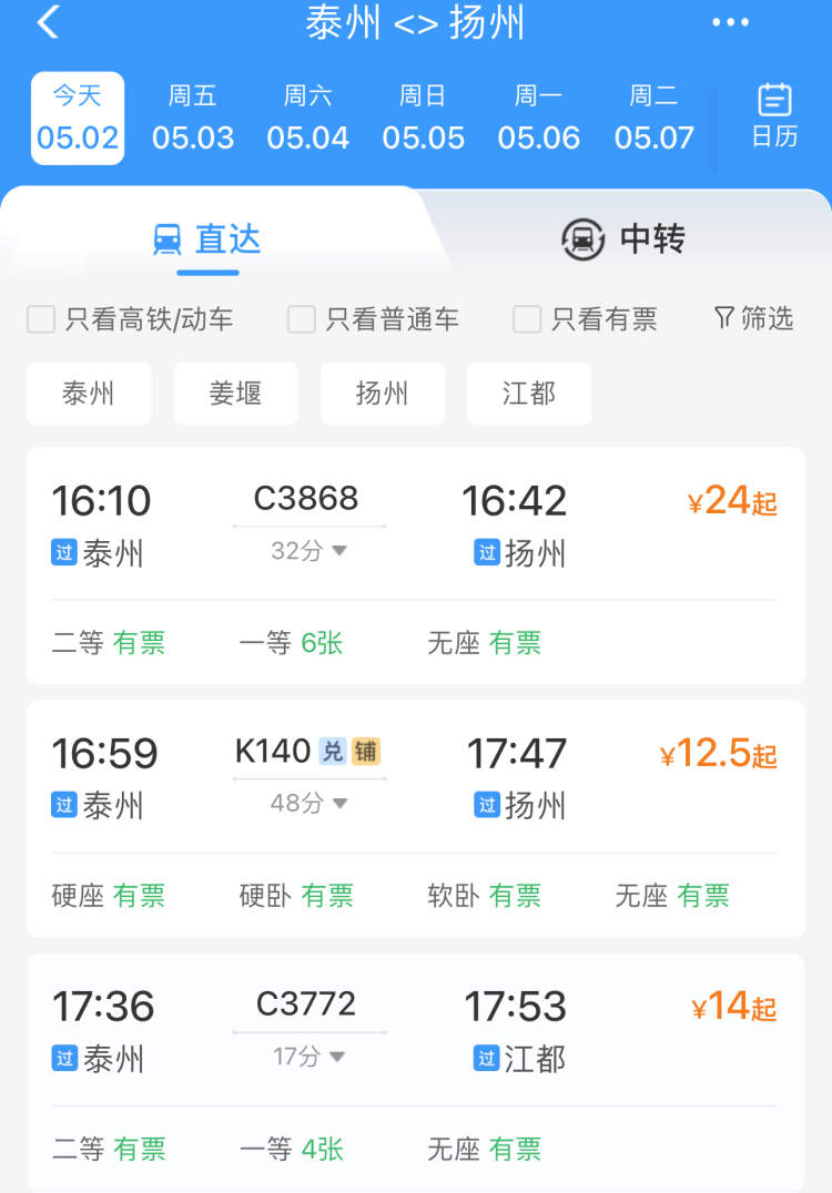 以江苏泰州为例,3号4号高铁仍有余票,在小长假后面几天来个短途游是个不错的选择,离上海约200公里,也可以考虑自驾。