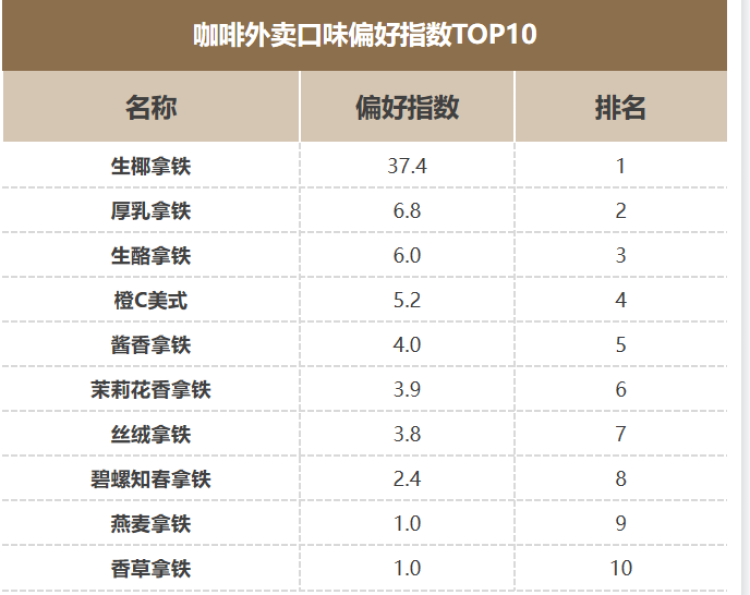 咖啡外卖口味偏好指数TOP10