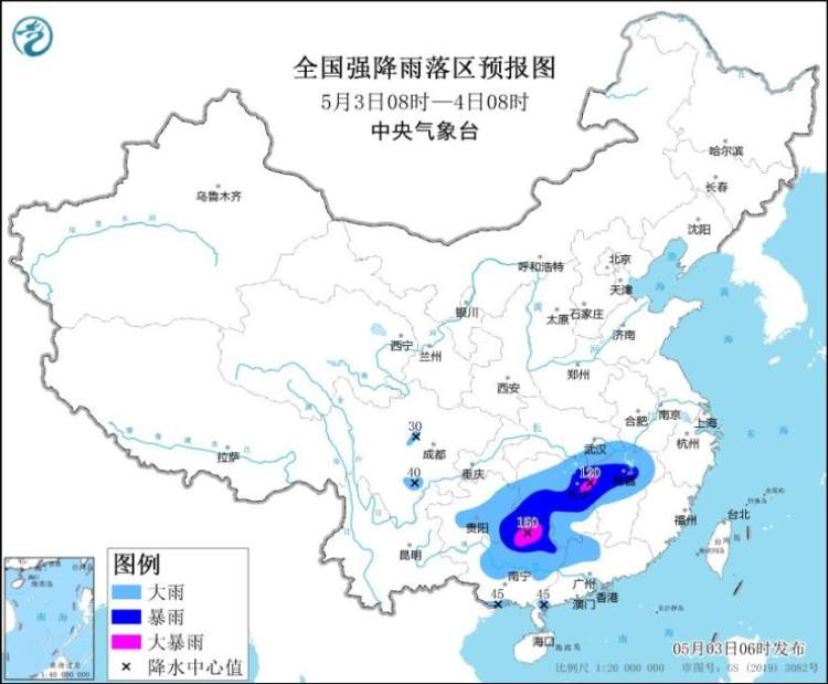 其中今天,贵州中东部、湖北东南部、安徽西南部、湖南、江西中北部、广东北部和西南部、广西中北部和南部沿海等地的部分地区有大到暴雨,其中,湖南东北部、贵州东南部、广西东北部等地局地有大暴雨(100~150毫米)。上述部分地区伴有短时强降水(最大小时雨量40~60毫米,局地可超过70毫米),湖南中部、江西西部、贵州东部和南部、广西东北部和南部、广东西南部等地的部分地区将有8~10级雷暴大风或冰雹天气,其中贵州中部、湖南中部、广西东部等地的局地将有10级以上雷暴大风,最大风力可达11级。中央气象台今晨继续发布暴雨蓝色和强对流天气蓝色预警。