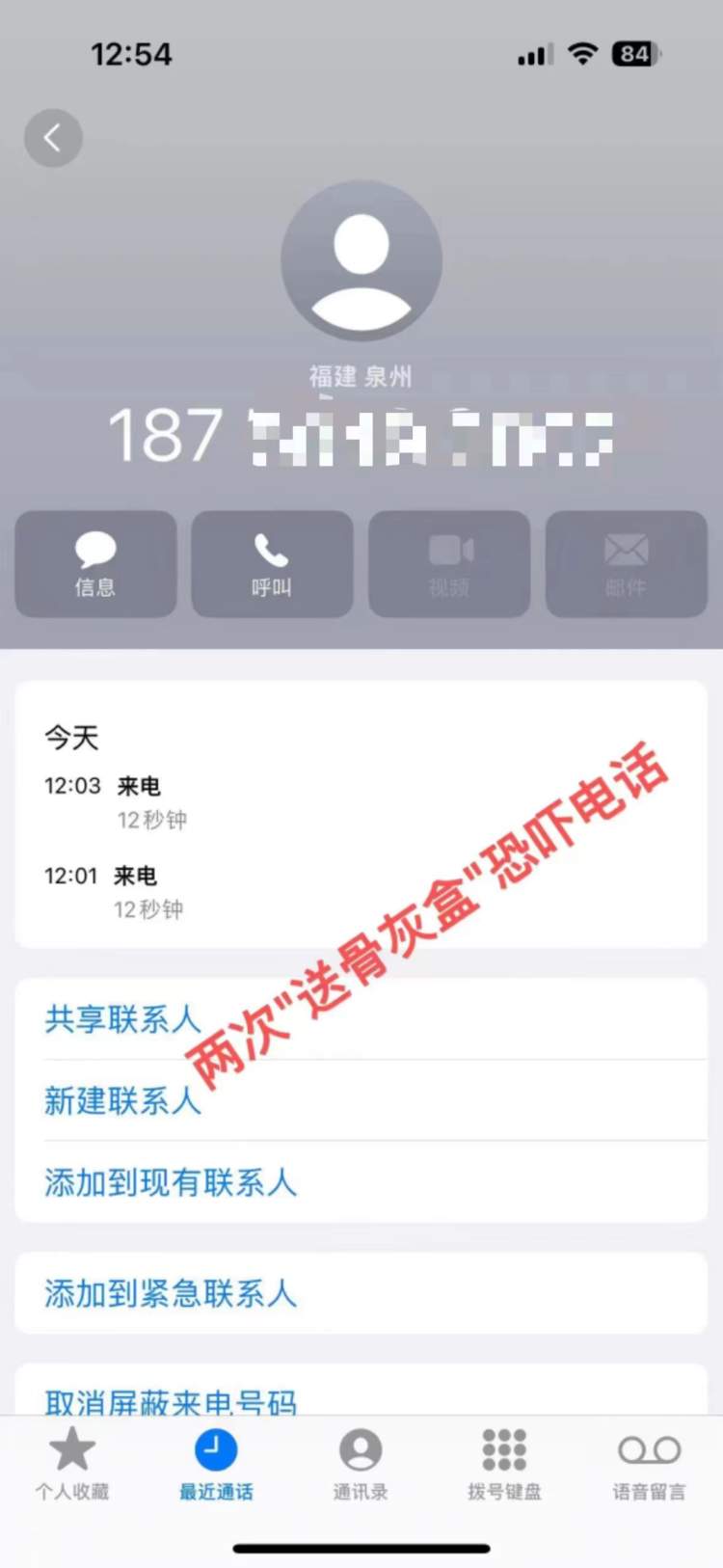 “这个电话一上来就说,‘你等着,我来给你送骨灰盒’。”还没等王先生的妻子反应过来,12点03分,这通电话再次拨了进来,“这次又说‘我给你全家送骨灰盒’。”