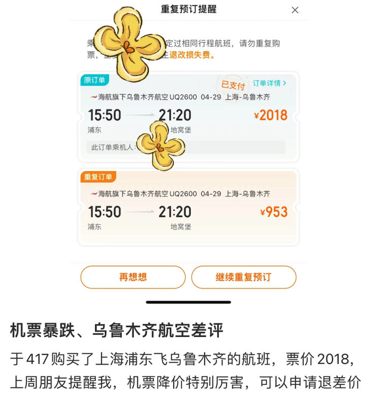 然而,吴小姐候补和观望了几日返程车票机票,直到出发前一天晚上八点也没等到机票降价,火车票也抢不到了,吴小姐决定和孩子一起买了高价机票,一名成人一名儿童,一共2000多元。按照儿童机票为全价票50%计算,全价票约为一千三四左右。600多元单人上海飞重庆,返程却要1300多元,遭遇“返程刺客”的吴小姐直到出发前12小时才下了决心买了高价返程票。