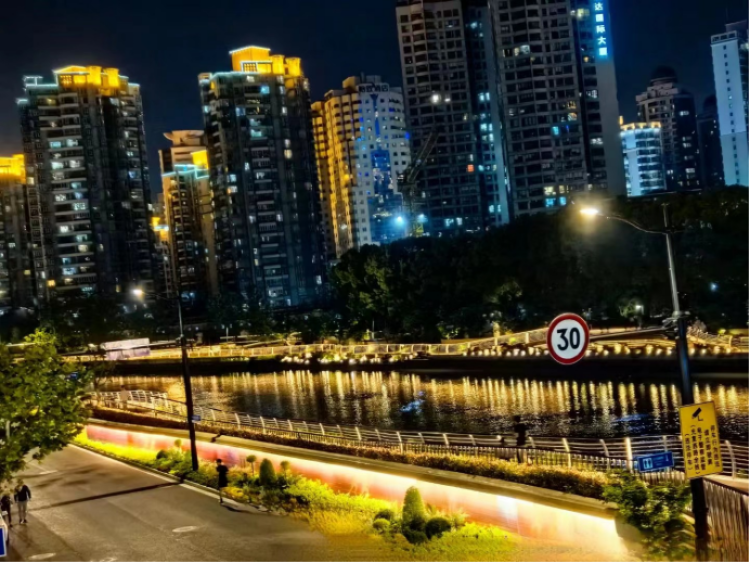 “申城这里曹杨路桥下一颗“夜明珠”,白天来玩过,晚上又来拍照打卡。夜晚下,曹杨路桥披上灯火璀璨的外衣,映衬在被晚风浮动而泛起波纹的苏河水面上,别有一番风味。”这是五一节晚上我原单位崇明农场姓王的农友告诉我。