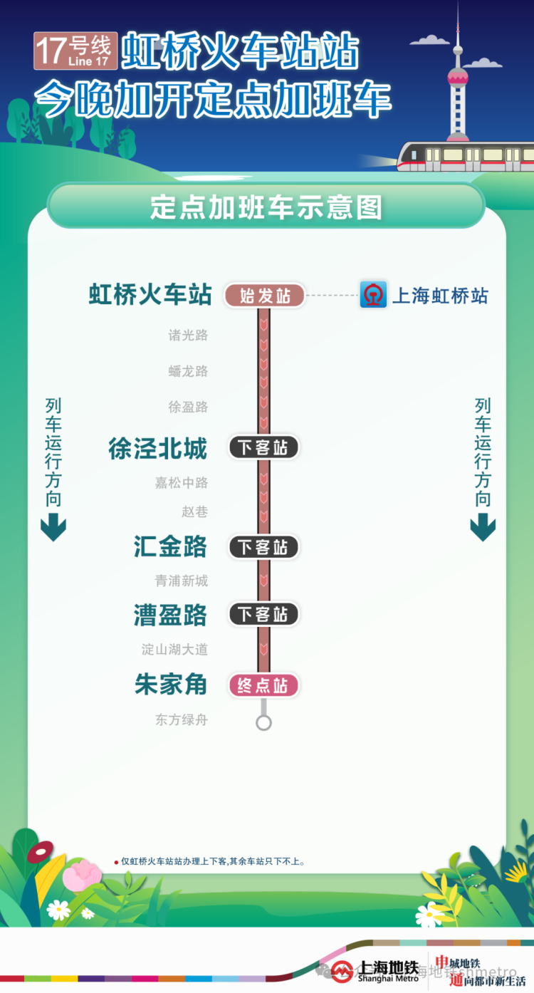 地铁17号线定点加班车始发站虹桥火车站站,终点站朱家角站。加班车沿途仅停靠徐泾北城站、汇金路站、漕盈路站、朱家角站(终到站),其余车站跳停。停靠车站中,虹桥火车站站(始发站)办理上客,其余车站只下不上。