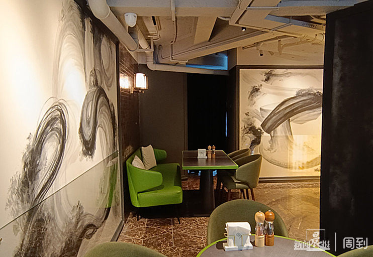 记者注意到,在店内还有两幅山水画作品,画家直接画在墙上,下方用玻璃做了局部保护,两幅作品名称分别为《鸣弦坐泉》《仙台岚霏》。Vivi告诉记者,这两幅作品由画家尹亿鹏(字白泽,号完达山人)创作,是一种新的中国山水画法表现形式。