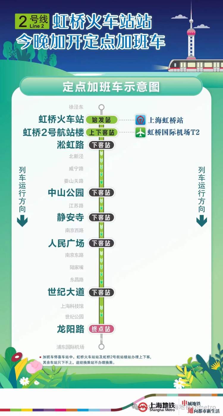 2号线定点加班车始发站虹桥火车站站,终点站龙阳路站,中途停靠虹桥2号航站楼站、淞虹路站、中山公园站、静安寺站、人民广场站及世纪大道站。其中除始发站虹桥火车站站及虹桥2号航站楼站可上下客,其余各停靠站都只能下客,途经换乘站不可换乘。