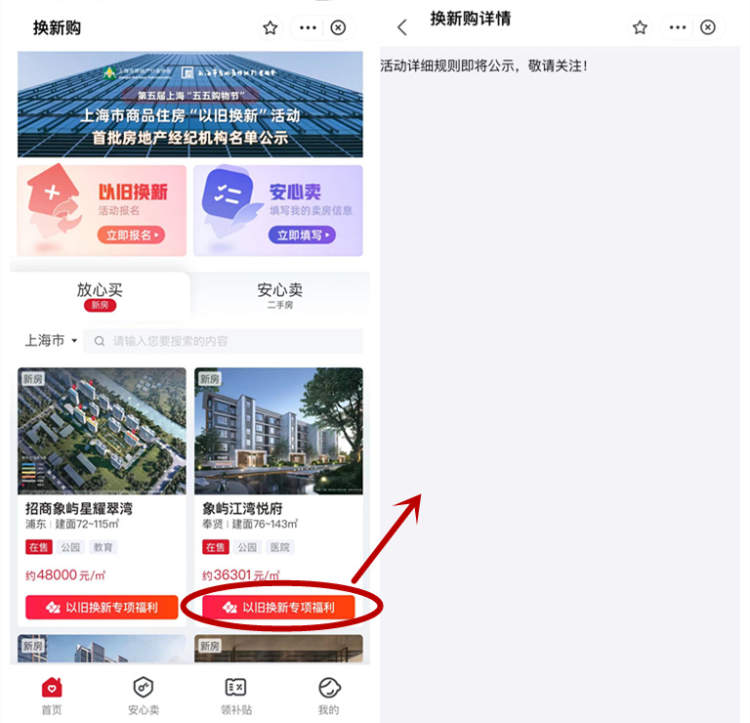 但今天,记者登录小程序,点击查阅各楼盘下面的“以旧换新专项福利”,都显示“活动详细规则即将公示,敬请关注!”