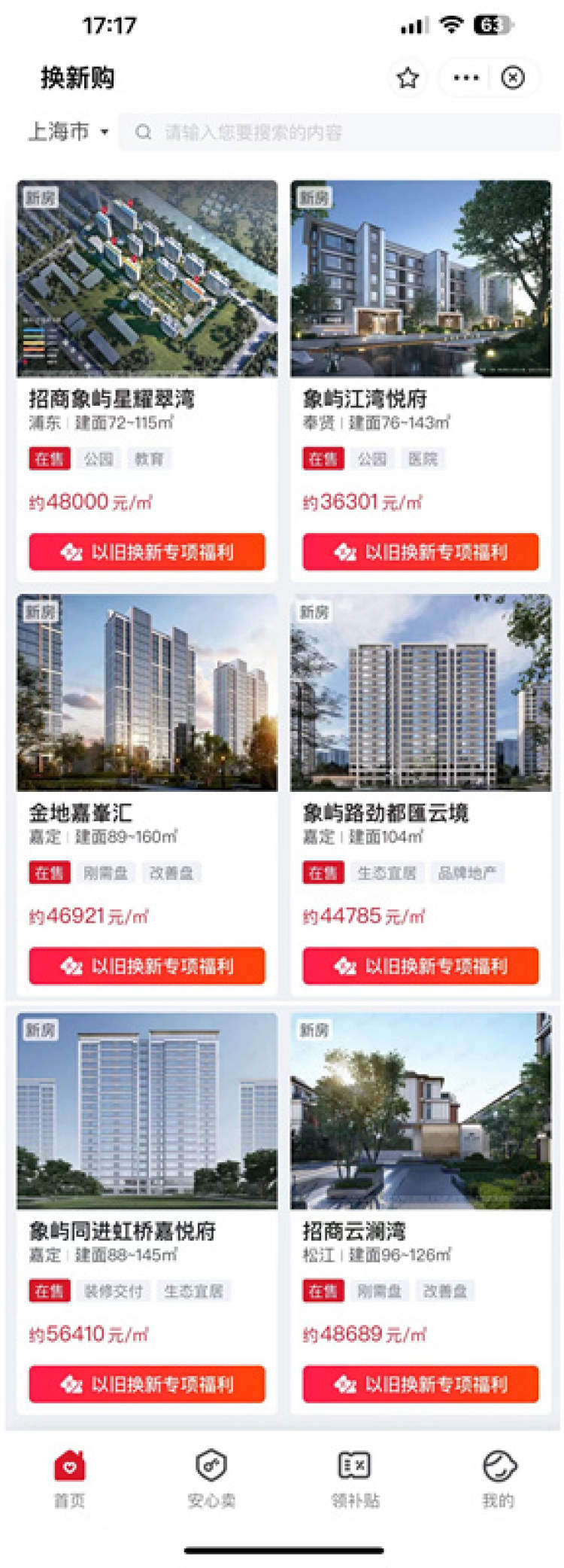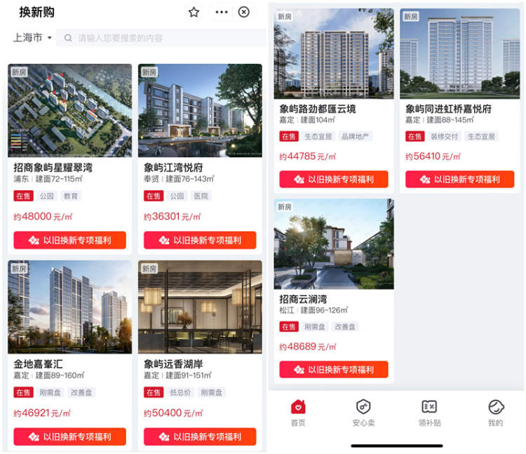 5月6日上午,记者在支付宝“乐居换新购”小程序上看到有7个楼盘上线,分别为:浦东的招商象屿星耀翠湾,奉贤的象屿江湾悦府,嘉定的金地嘉峯汇、象屿远香湖岸、象屿路劲都滙云境、象屿同进虹桥嘉悦府,还有松江的招商云澜湾。