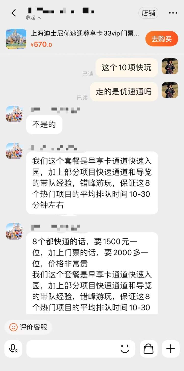 记者以消费者身份在淘宝上随机咨询了几个商家,他们的销售套路大致相同,快速通道售价从570元到5000元不等,大多都是模糊“快速通道”的概念。一位商家直接表示,他们走的就是普通通道。在下完单以后游玩的前一天晚上,商家会安排工作人员打电话联系具体的集合时间和地点,然后第二天在园区门口集合。