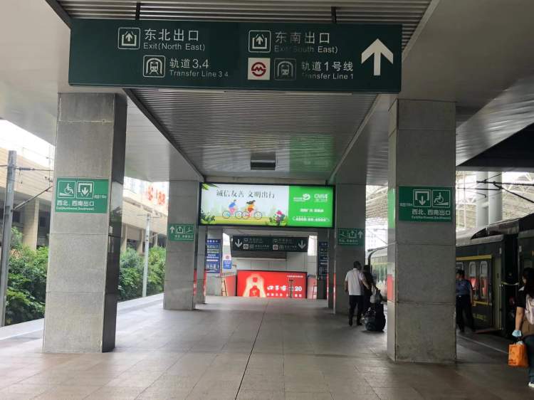 在火车站站台的柱子上,非常醒目地张贴了标识,告诉旅客西北、西南出口是无障碍通道,向前多少米,并且,下方还有一张无障碍通道大斜坡的照片。同时,这个标识还告诉旅客,换乘地铁三、四号线走西北出口,换乘地铁一号线走西南出口。