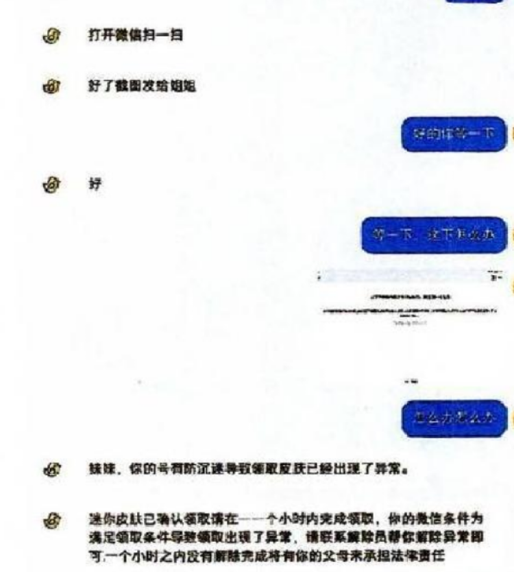 随后王某某等人就会以留言或私信方式告知对方可免费获赠一款该游戏皮肤,低年龄被害者们往往无法判断网络留言真实性,当他们回复消息询问领取方式,王某某等人便与之聊天,先确定对方性别、年龄等个人信息,随后将洪某某所制作的二维码发给对方,让对方扫码领取。事实上扫码后会提示“领取失败且账户异常,需解除异常状态”。