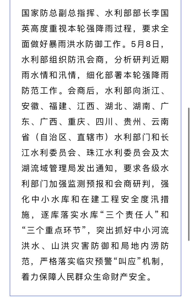 5月8日,水利部组织防汛会商,分析研判近期雨水情和汛情,细化部署本轮强降雨防范工作。会商后,水利部向浙江、安徽、福建、江西、湖北、湖南、广东、广西、重庆、四川、贵州、云南省(自治区、直辖市)水利部门和长江水利委员会、珠江水利委员会及太湖流域管理局发出通知,要求各级水利部门加强监测预报和会商研判,强化中小水库和在建工程安全度汛措施,逐库落实水库“三个责任人”和“三个重点环节”,突出抓好中小河流洪水、山洪灾害防御和局地内涝防范,严格落实临灾预警“叫应”机制,着力保障人民群众生命财产安全。
