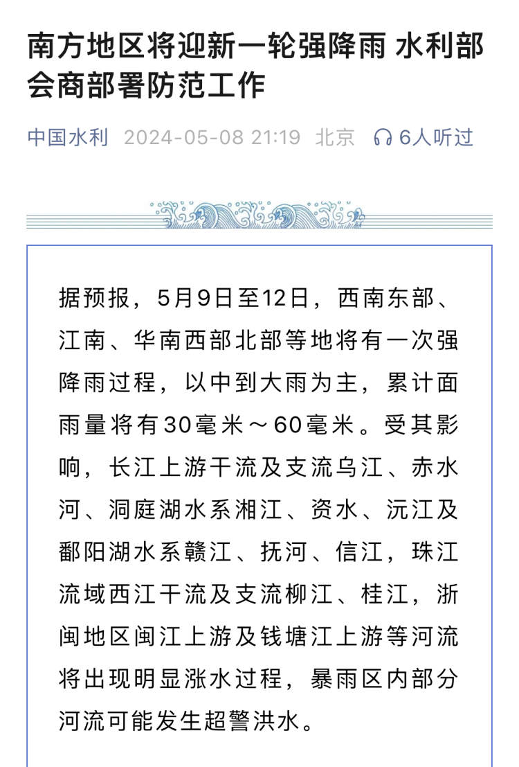 据水利部微信公众号“中国水利”5月8日晚消息,据预报,5月9日至12日,西南东部、江南、华南西部北部等地将有一次强降雨过程,以中到大雨为主,累计面雨量将有30毫米~60毫米。受其影响,长江上游干流及支流乌江、赤水河、洞庭湖水系湘江、资水、沅江及鄱阳湖水系赣江、抚河、信江,珠江流域西江干流及支流柳江、桂江,浙闽地区闽江上游及钱塘江上游等河流将出现明显涨水过程,暴雨区内部分河流可能发生超警洪水。