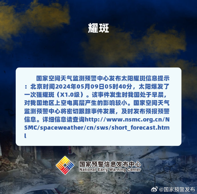 神州播报|太阳今早爆发一次强耀斑 周到君 2024-5-09 来源:周到上海 国家空间天气监测预警中心发布太阳耀斑信息提示:北京时间2024年05月09日05时40分,太阳爆发了一次强耀斑(X1.0级)。该事件发生时我国处于早晨,对我国地区上空电离层产生的影响较小。国家空间天气监测预警中心将密切跟踪事件发展,及时发布预报预警信息。 来源:周到上海 作者:周到君 赞一个 (0)