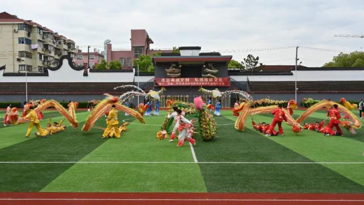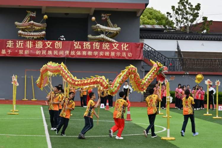 龙腾狮跃,热闹非凡,近日,一场“走近非遗文创 弘扬传统文化——基于“双新”的民族民间传统体育教学实践展示活动”在上海市三林中学举行。