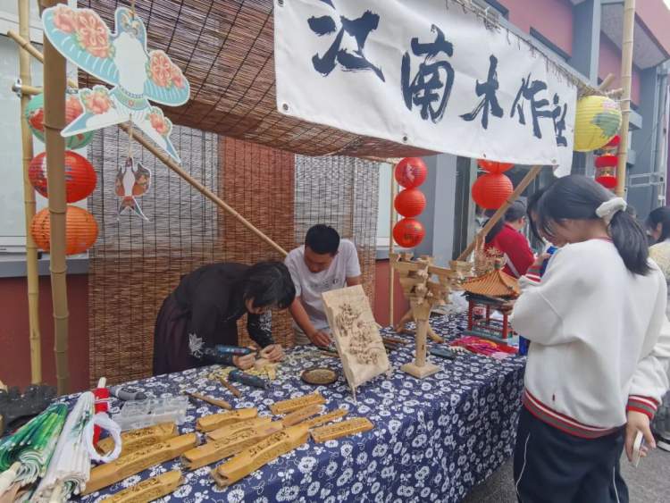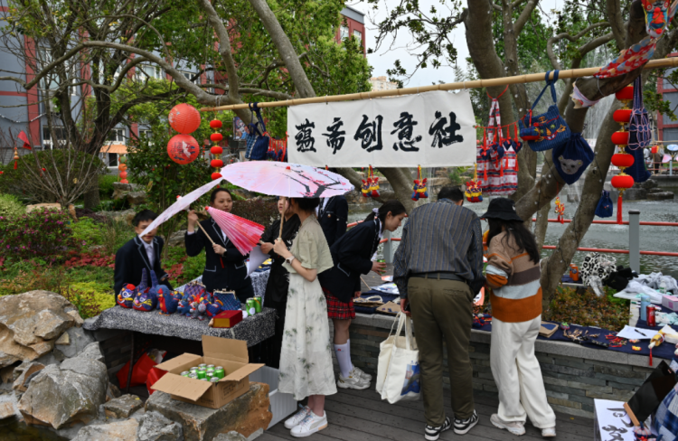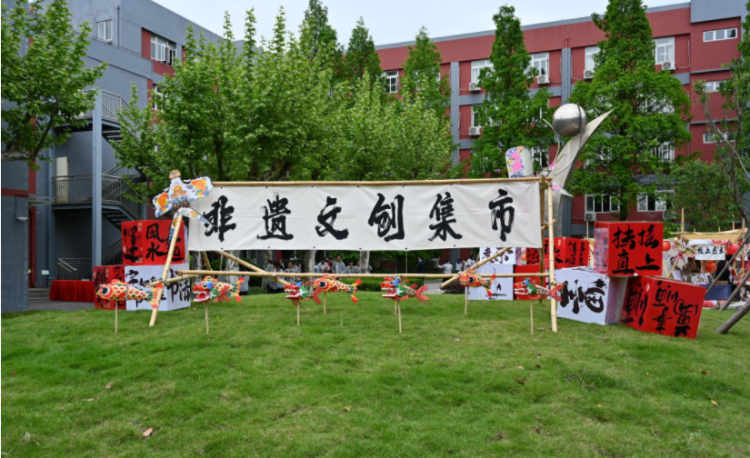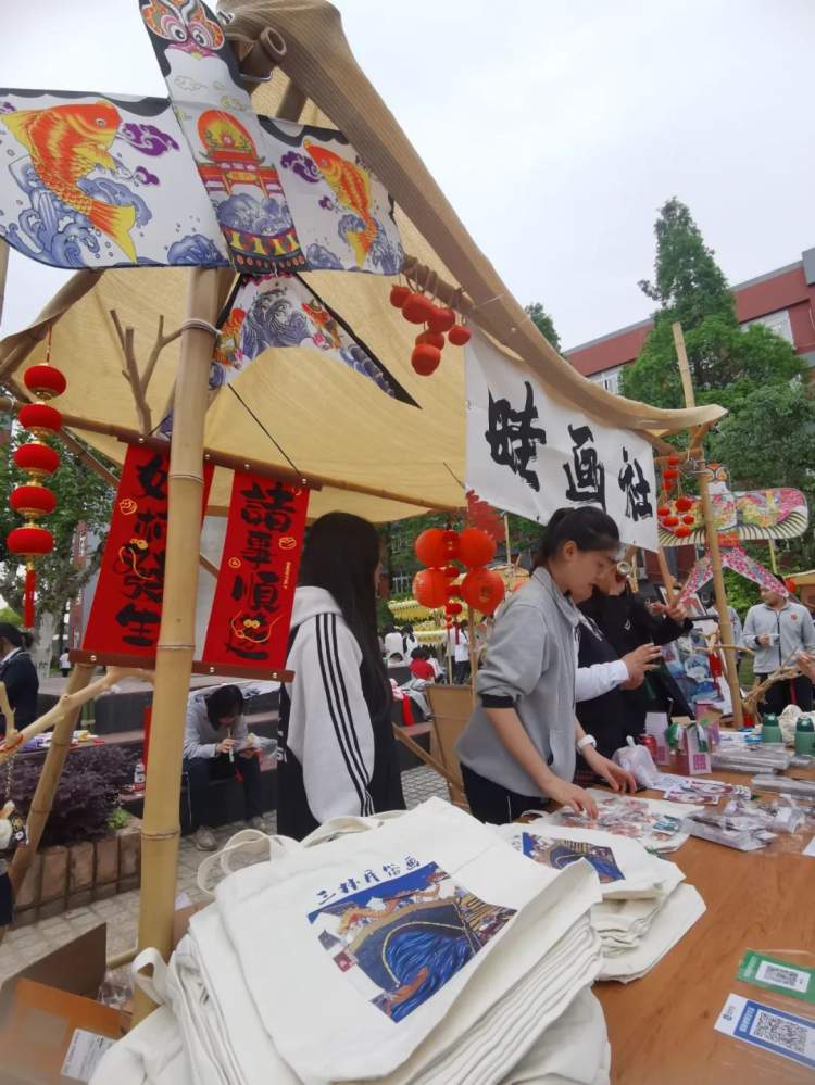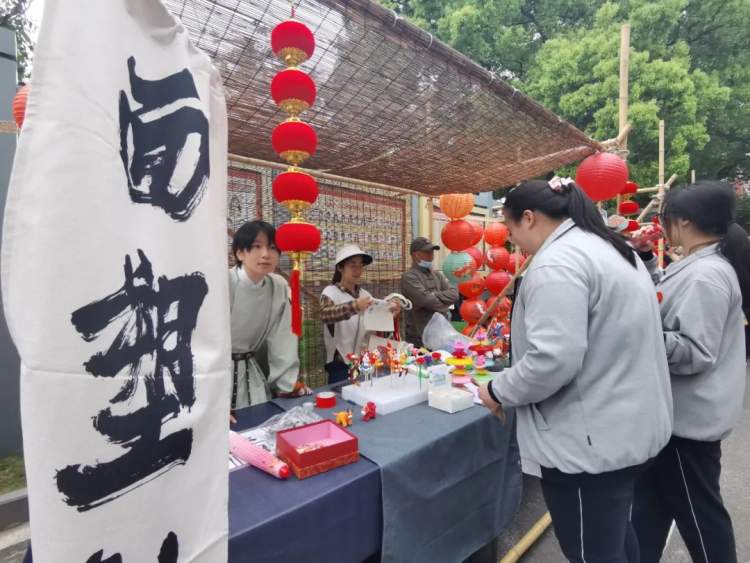 与此同时,操场上的非遗文创集市如火如荼,非遗文创集市为非遗通识课程(SAN)、非遗特色课程(LIN)、非遗创意课程(TED)的成果提供集中的展示平台。同学们通过作品义卖、体验游戏、创意分享等形式,交流学习成果,收获乐趣。