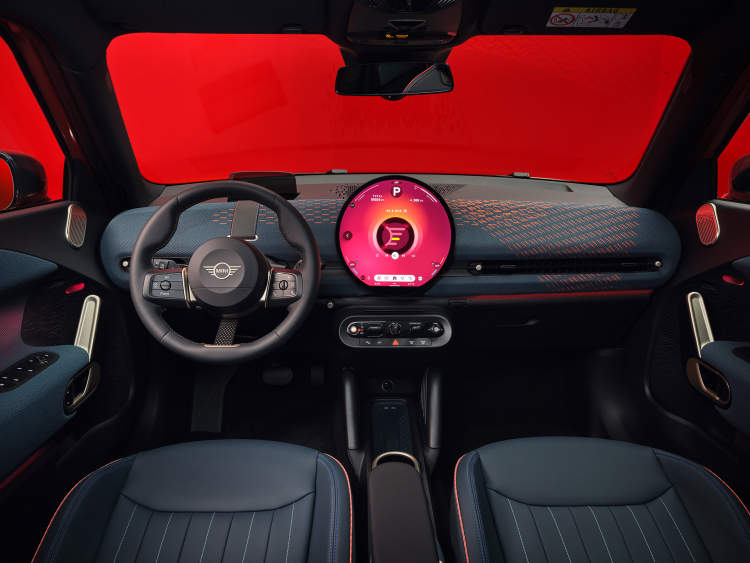 “迷你至简”设计风格在全新车型的内饰中尤为明显。车内着意减少冗余装饰,遵循了MINI自诞生起就应用的“实用至上”原则,保留了致敬经典Mini车型的三个关键设计元素,即更易于操作的全新方向盘、独特的圆形OLED中控屏、经过改造的5联式拨杆,仿佛将MINI的历史衔接在新车型上。