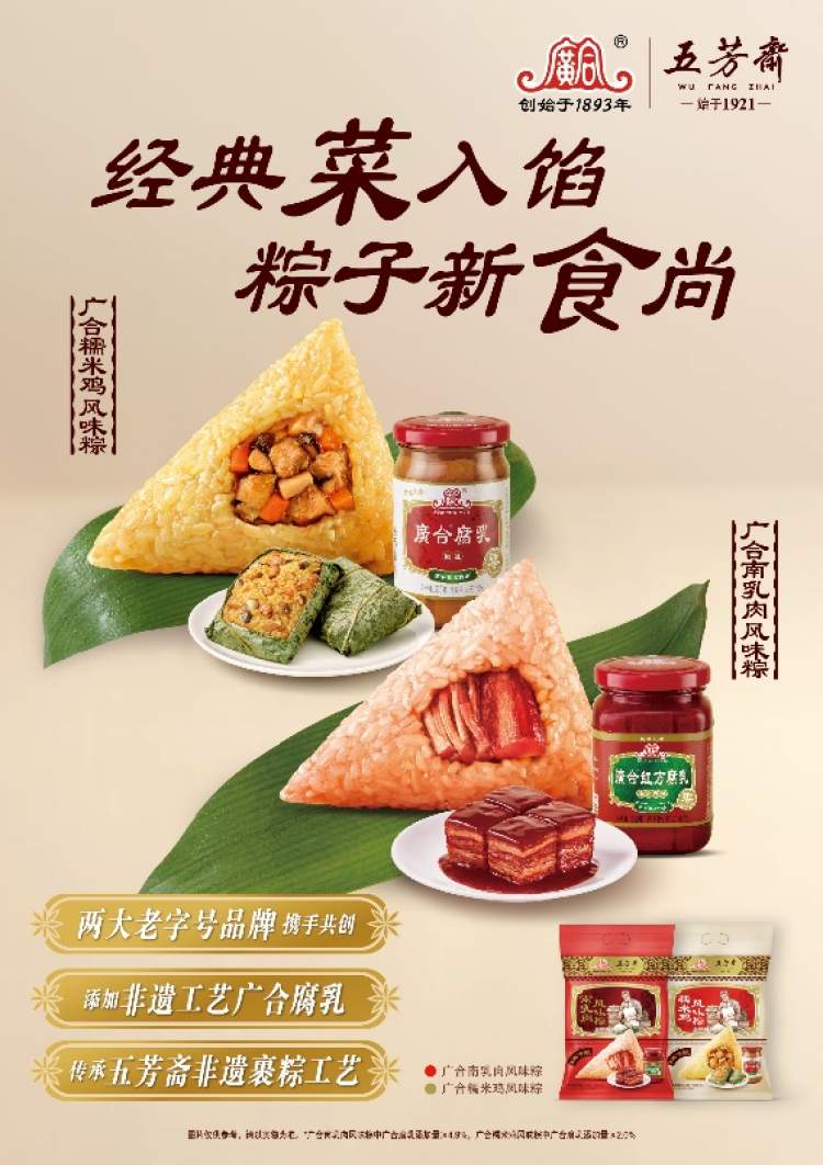 今年端午,广合非遗腐乳酿造工艺携手五芳斋非遗手工裹粽工艺,推出广合腐乳风味粽,精心研发南乳肉、糯米鸡风味粽两种口味,为消费者带来别样味蕾体验。南乳肉粽中,五花肉遇上醇厚鲜甜的广合红方腐乳,搭配油润的糯米,咸甜软糯。清香粽叶包裹广式经典小吃糯米鸡,内馅中用广合白方腐乳腌制的大颗鸡腿肉与猪腿肉搭配胡萝卜与杏鲍菇,口感丰富,鲜香四溢。