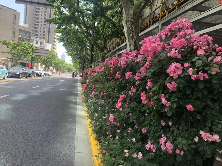 在淮海中路、河南中路等路段,记者也发现了小规模的月季花墙。如果论长度,推荐市民一定要去奉贤走一走,奉浦工业开发区肖南路、程河浜路、奉浦大道、南奉公路、南亭公路,都是绵延两三公里,甚至四五公里的月季大道。