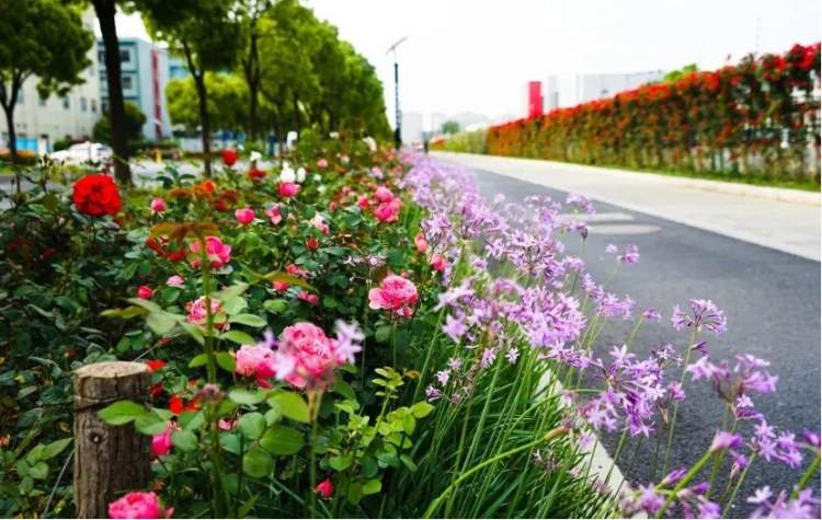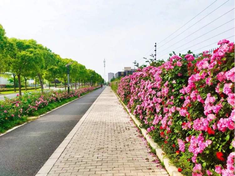奉浦工业开发区肖南路月季大道北起环城北路,南至程普路,共栽植了2.5公里藤本月季、1.75万株藤本蔷薇以及11.10万株灌木月季,种类包含梅郎口红、粉扇、绯扇、金镶玉等,一共15个颜色。程河浜路月季大道与肖南路呈十字相交,栽植了近1.2公里藤本月季和藤本蔷薇2000多株。一株株、一排排错落有致,红的、粉的花朵摇曳生姿。穿行在这条如诗如画的月季路上,无论视觉还是嗅觉上,都是一种美的享受。工业区道路比较安静,特别适合拍照打卡。