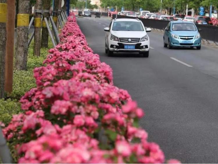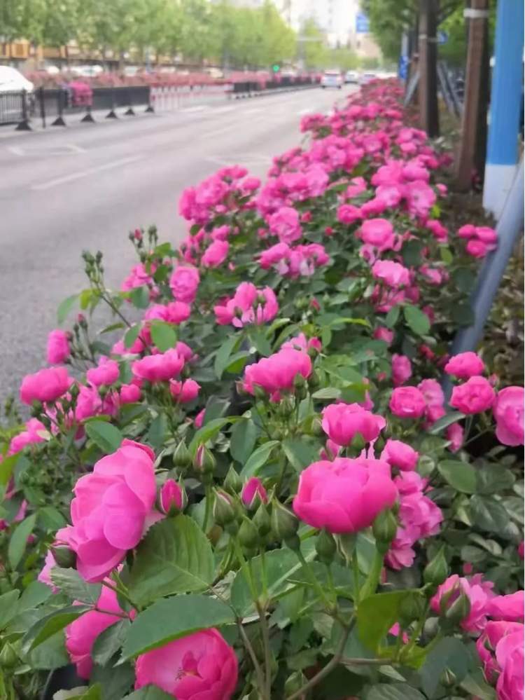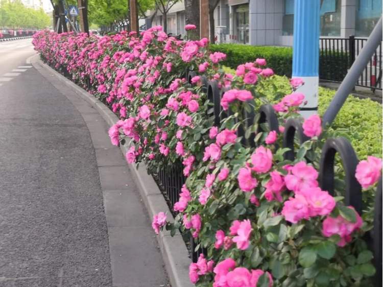 南奉公路、南亭公路机非隔离带围栏月季西起沪杭公路,东至环城东路,种植安吉拉月季1.25万株,月季长度约4.2公里,十分惊艳。