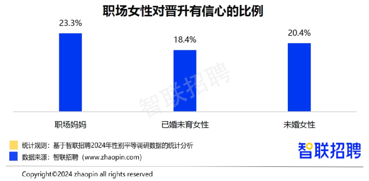 智联招聘调研数据显示,随着经济形势向好,职场妈妈对个人发展也怀抱信心,认为升职“可能性较大”和“肯定会升职”的已婚已育职场女性共占比23.3%,高于未婚女性的20.4%和已婚未育女性的18.4%。除了反映职场妈妈有着更强的发展自信,也可能反映出“幸存者偏差”,即在生育后仍然留在职场中的女性本身工作意愿较强或者有着生育友好的职场环境。