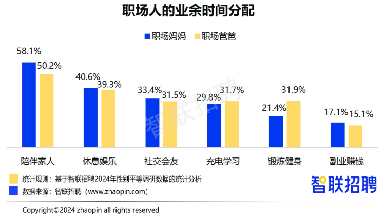 相比之下,职场爸爸会将更多时间花在充电学习和锻炼健身上。这一业余时间分配的差异可能体现出男女性对社交娱乐和健身的不同偏好,也可能反映出职场妈妈需要在爱家人和爱自己之间寻找最佳平衡点。