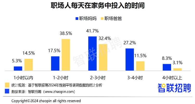 在生活中,职场妈妈们仍是家务活的主力,77.2%的职场妈妈每天家务时间在2小时以上,超过去年的67.5%,也大幅高于职场爸爸的47%。不过,值得注意的一个数据是,去年仅16%的职场爸爸每天做家务时间在2小时以上,而今年职场爸爸的家务表现明显提升达到了32.4%,社会性别平等意识的不断加强,让职场爸爸愈加意识到家务应是夫妻共同的“任务”。