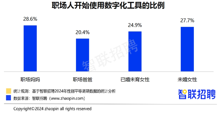 面对人工智能等新技术的迅速发展,职场妈妈们积极向上,顺应时代的趋势,有28.6%的职场妈妈表示“已经开始使用一些数字化工具”,占比高于职场爸爸的20.4%,也高于未婚女性的27.7%和已婚未育女性的24.9%,可见职场妈妈认知积极进化数字技能有益于提高工作效率,增强职场竞争力。