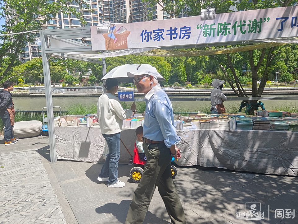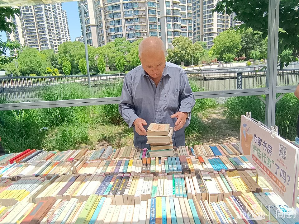 5月14日上午10点,已经有不少读者和住在附近的居民在“淘书乐”旧书市集挑书选书了。记者在现场遇到了刚刚赶来的老书迷陆先生,不一会儿已经选了好几本书,有市民称他选书眼光独到。