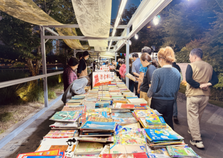 晚上6点,“淘书乐”旧书市集开始亮灯,下了班的市民陆续赶来,还有带着孩子来的家长,加上附近的居民。与白天相比,夜晚的旧书市集现场更加闹猛了。据悉,当天旧书收购收了满满的9大箱书,而老书迷陆先生则买了6大包书,可谓是他又一次满载而归。