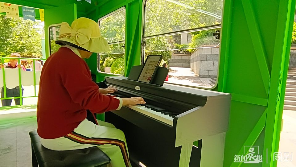 在“钢琴巴士”里面,记者遇到正在弹琴的市民马阿姨,她弹奏的是一曲《秋日私语》。马阿姨今年65岁,她刚刚拿到老年卡,退休之前曾经是一位媒体人。马阿姨告诉记者:“我钢琴是在网上学的,弹奏还不是很熟练,今天想来看网红打卡点天安千树,正好看到这里有旧书市场,顺便逛一下。”
