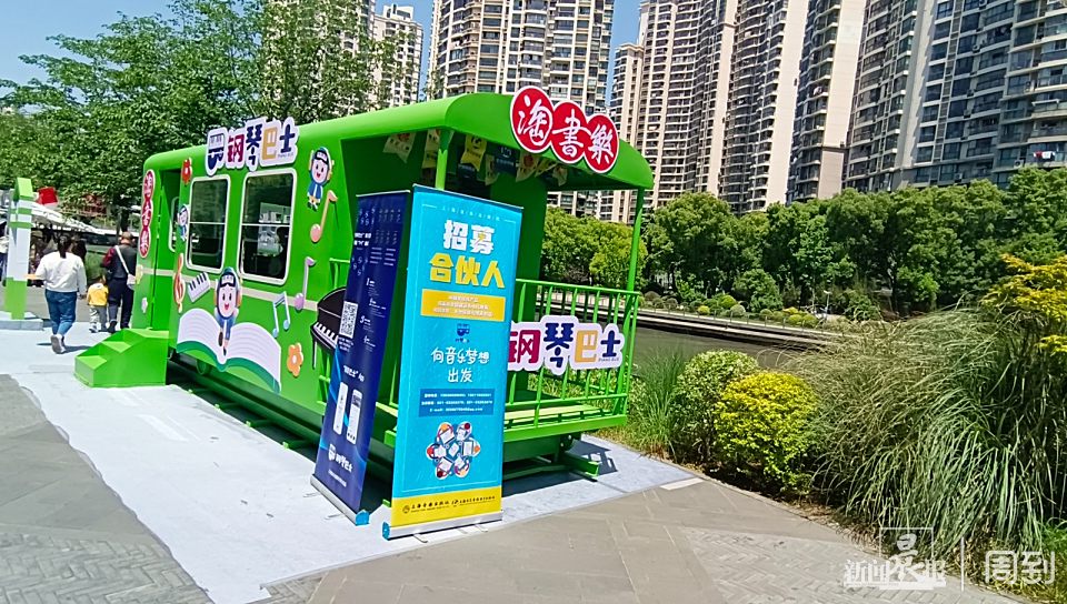 在淘书现场,书香、琴音不期而遇。上海音乐出版社在河滨步道的巴士造型装饰物中放置一台智能钢琴,将其变身为“钢琴巴士”。