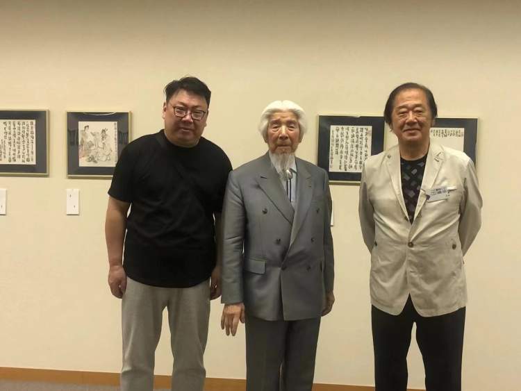 嘉宾合影(左起:中国艺术家庞飞、日本书法泰斗杭迫柏树先生,读卖书道会理事、谦慎书道会常任理事疋田惜阴先生)