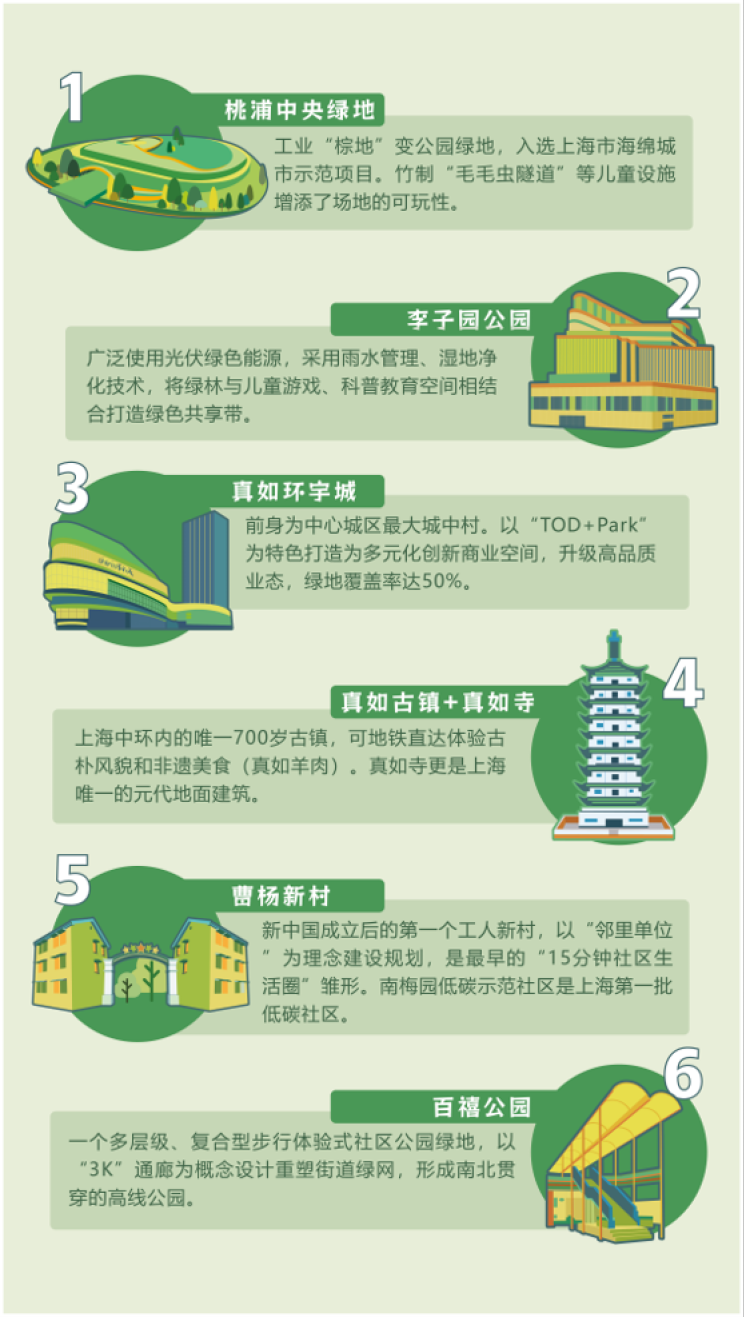 碳寻公园绿意游,以公园+低碳为主题,在城市更新的典型案例中感受上海城市文化,找到自然入口。游览点位包括李子园公园、真如古镇、曹杨新村等。李子园公园广泛采用光伏发电技术,雨水花园、湿地净化技术,打造绿色共享空间。曹杨新村的南梅园是上海第一批低碳社区。