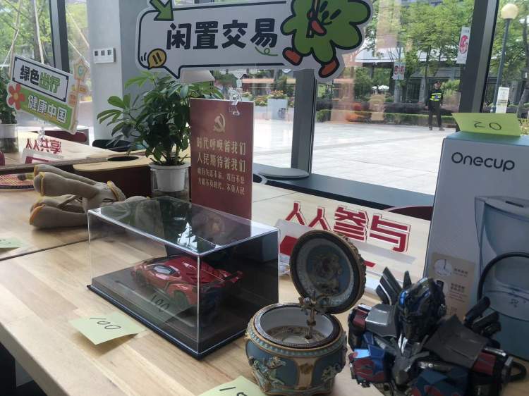 今天的低碳日宣传活动中,闲置物品交易、低碳知识问答、废旧物循环利用等展示