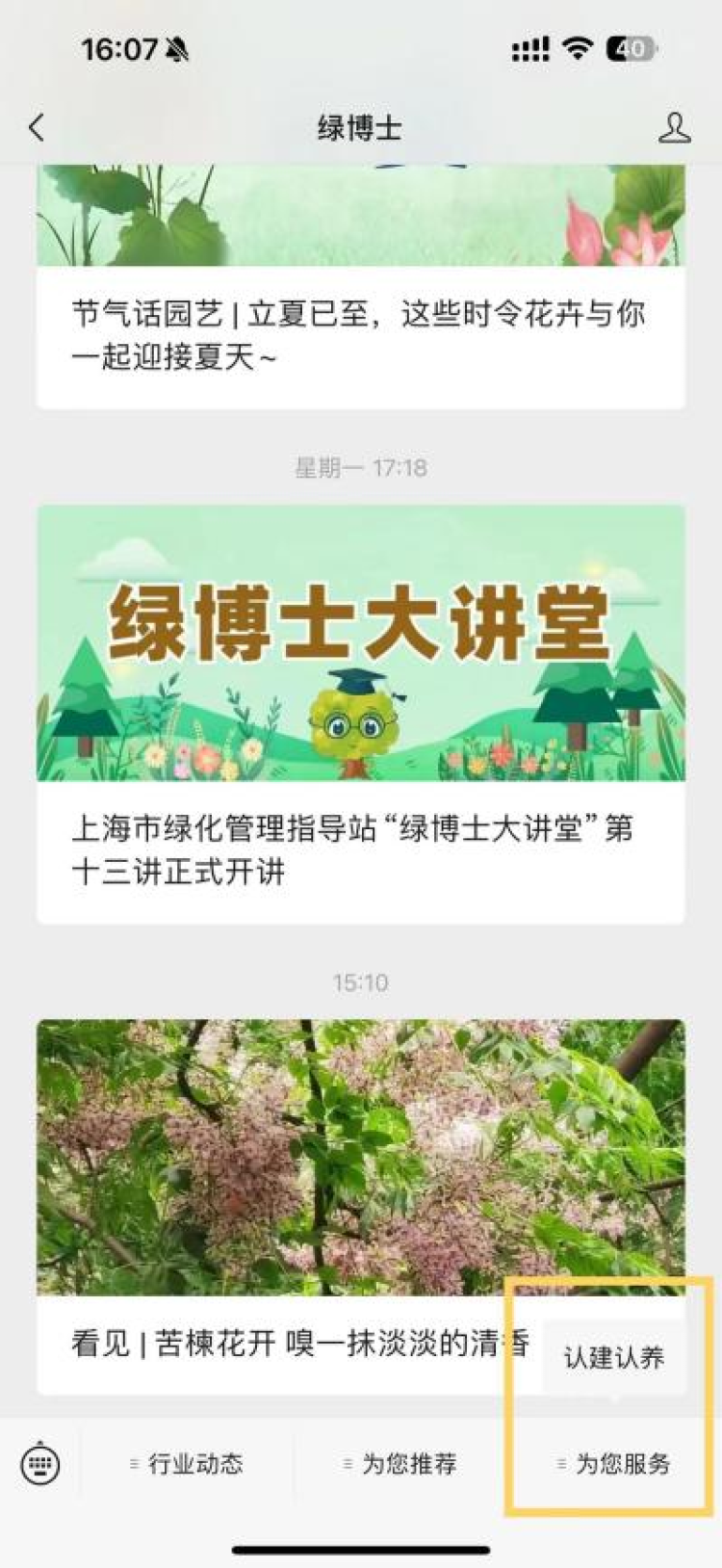 ·如从“绿博士”微信公众号进入,需点击页面下方菜单栏“为您服务”,找到“绿化认建认养”栏目,点击即可登录认建认养平台。