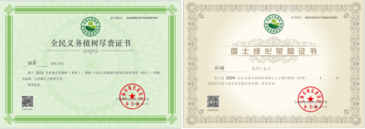 据了解,参加线上全民义务植树的适龄公民(男11岁至60岁,女11岁至55岁)支付满90元可获得《全民义务植树尽责证书》,支付满180元可获得《国土绿化荣誉证书》;非适龄公民、单位团体、外籍人士以及港澳台同胞支付满30元,可获得《国土绿化荣誉证书》。认建认养平台首页点击“证书查询”,可时刻关注树木认养情况,并下载相应证书。