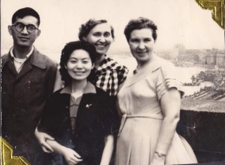上世纪50年代末,吴丽娟(图左2)接待苏联外宾时登上上海大厦18楼露台