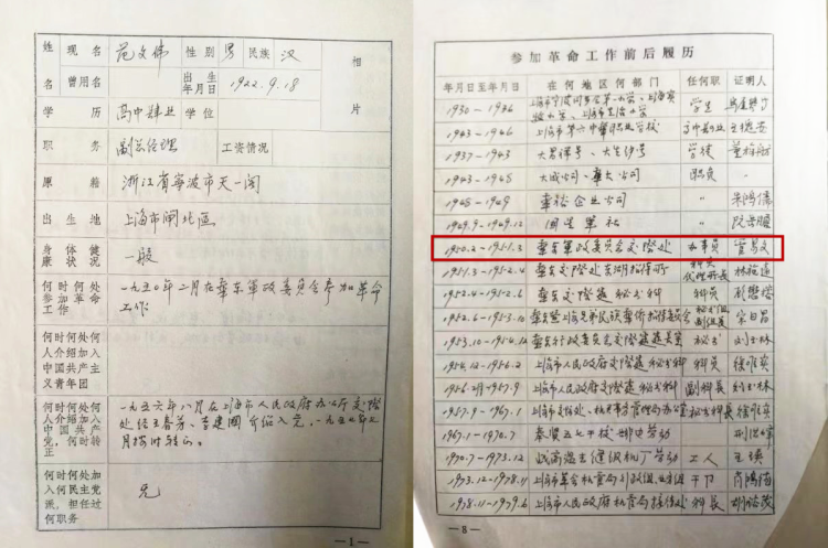 范文伟填写参加革命工作前后的履历,其中1950年2月进华东军政委员会交际处当办事员