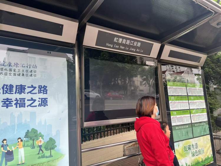 至于公交站台顶上的屏幕,据公交站台运营公司相关负责人员所说,中间的这块屏幕大多显示的是站点的名称,闵行的公交站台的名称已经写在了站台的信息栏上,因此目前没有打开。旁边两块黑色的区域是做什么的,他也不清楚。