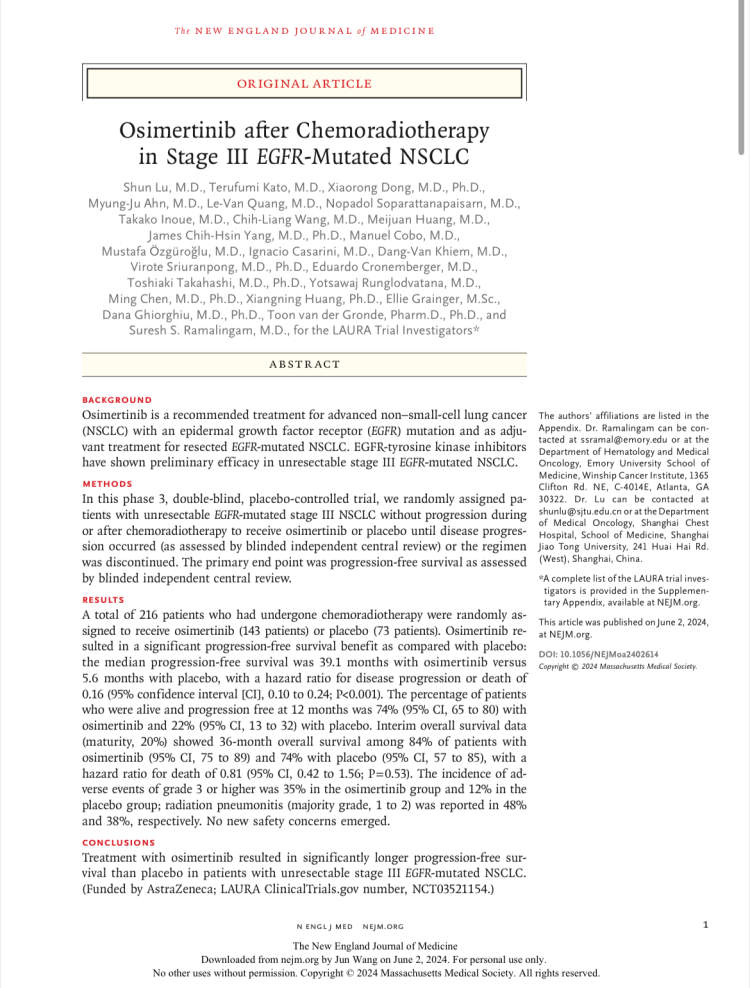 2024年美国临床肿瘤学会年会上,LAURA研究成果也做了“全体大会报道”发言,获得全球肿瘤学领域专家的热议和好评。此项研究成果的发表,标志着Ⅲ期不可切除非小细胞肺癌患者靶向治疗模式的成功,或将改写今后的治疗格局。下一步,LAURA研究还将在延长患者总生存期、转移病灶治疗效果等方面做出进一步探索。