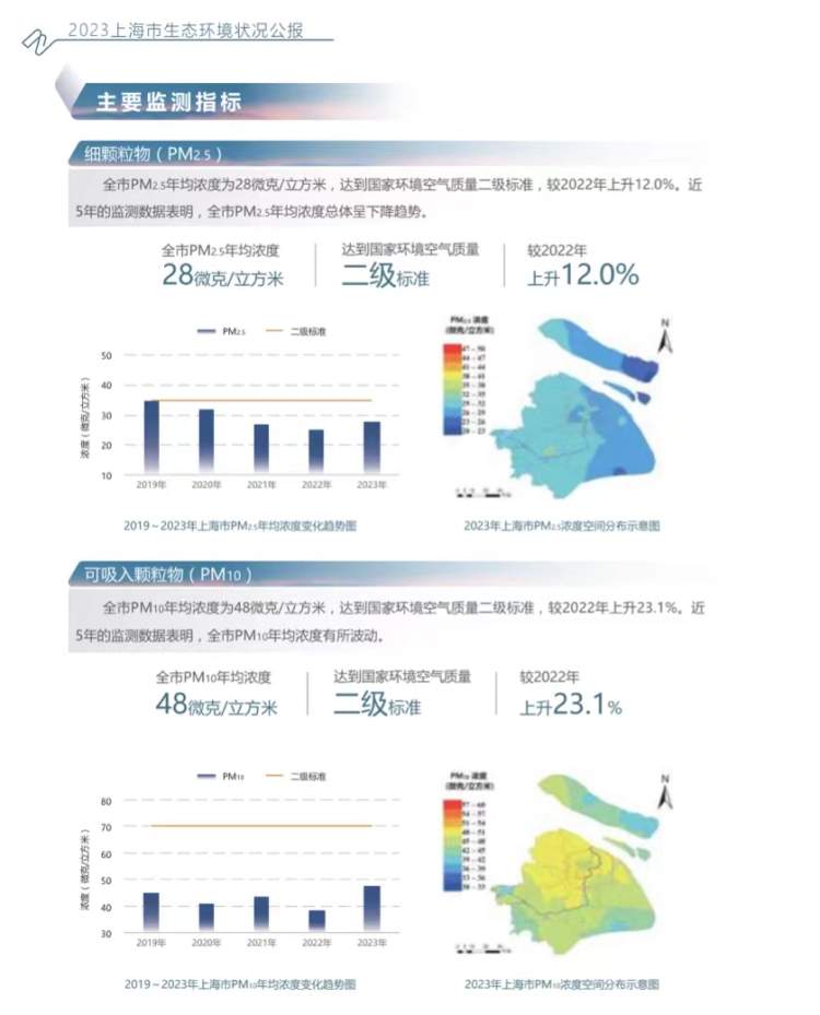 虽然总体来看,近5年来,上海的PM2.5年均浓度呈下降趋势,但较2022年上升了12%。PM10年均浓度有所波动,去年年均浓度为48微克/立方米,比2022年上升了23.1%。
